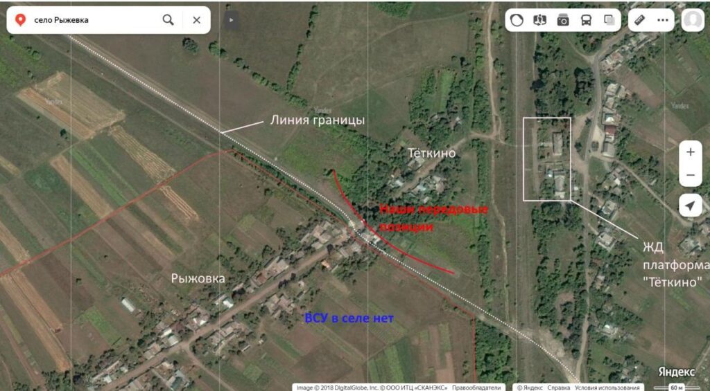 После потери контроля над приграничным селом Рыжевка украинские войска с потерями отошли южнее и юго-западнее – на несколько километров вглубь Сумской области. Сумское направление: Рыжовка… Вчера в наших пабликах появилась информация о том, что мы якобы взяли под свой полный контроль первый населенный пункт Сумской области — село Рыжовку (Белопольского района). Я сам с тех мест, а потому ситуацию знаю очень хорошо. На самом деле, чтобы понять происходящее, нужно взглянуть на карту. «украинское село Рыжовка» и «русское село Тёткино»есть суть один населенный пункт, посреди которого в 1991 году появилась государственная граница, на которую … до 2014 года особо никто не заморачивался. А улица Пограничная в обоих населенных пунктах переходила одна в другую (разделенная маленьким КПП). Причем от первых жилых хат Рыжовки до первых жилых хат в Тёткино (до 2022 года) было всего 30 метров. А до «российской» ЖД платформы Тёткино около 200 метров.