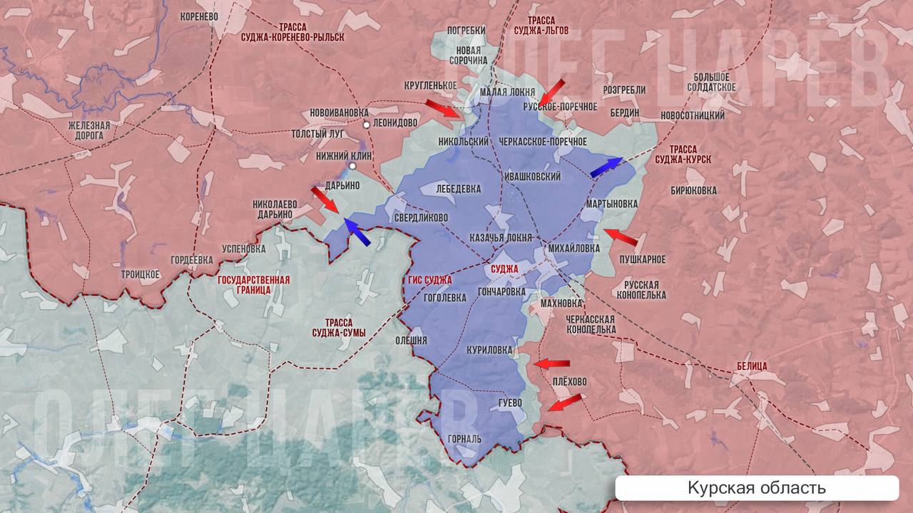 В районе Свердликово ВС РФ зашли на окраины села и выбили ВСУ из нескольких опорных пунктов в окрестных лесополосах. Идут упорные бои. Свердликово стоит примерно в 11 км к северо-западу от Суджи, его потеря может резко ухудшить логистику противника.