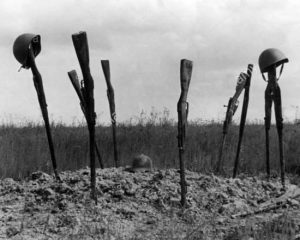 «Мы дошли до большого луга, на котором среди густой высокой травы и между окопами, торчали вертикально и слегка качались от ветерка, воткнутые штыками в землю несколько сотен винтовок, напоминая очень редкий лес после пожара. На земле было множество лежащих винтовок, карабинов, саперных лопаток, валялись патронташи с патронами, ручные гранаты, попадались и каски. Вся эта картина […]