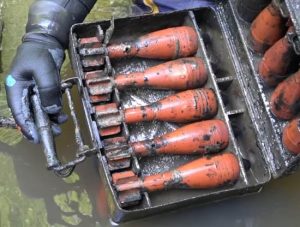 В этих местах проходили жесточайшие бои. Об этом красноречиво говорят не сработавшие гранаты Ф1 подняты из реки, немецкие каски в разной степени сохранности. Тяжелый немецкий 150-мм не сработавший снаряд, со следами от нарезов в передней части, а так же другие снаряды и гильзы самых различных калибров. Пуговица военнослужащего из Воронежской губернии. Немецкий противогазный бак с […]