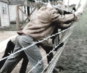 Немецкие охранники сдаются в плен, из бараков выходят узники и начинают самосуд — в первую очередь над узниками, которые прислуживали нацистам. Кресты на спинах по всей видимости являются заменой полосатой робы и обозначают человека — как узника. В цветной хронике освобождения Бухенвальда красные треугольники — маркер для политзаключенных, B-бельгийцы, F-французы и т.д.Во второй части заключенным […]