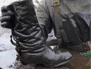 Советский гвардеец найденный в болоте зимой с номерным значком. Каска и лопатка имеют серьезные осколочные повреждения, берцовые кости не найдены. Винтовка с примкнутым штыком, полный цинк патронов, камень для заточки опасных бритв и другие находки.Так же в этой подборке раскопки пары больших немецких блиндажей летом этого года, еще один «богатый» немецкий блиндаж и место большого […]