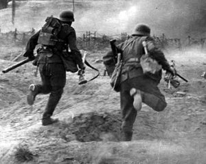 Минометчик Игорь Иосифович Николаев, наглядно произнесет тот самый боевой клич немецких солдат, который слышал сам и хорошо запомнил. Он форсировал Днепр осенью 1943 года.«Такая благодать, самолет где-то там высоко гудит, черт с ним. Солнышко, листья, играют тени, в термосах принесли завтрак, закурили и дымок так плывет над нами. И вдруг: «Третья минометная приготовиться к форсированию!». […]