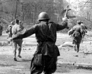 Кадры уличного боя, под прикрытием заградительного огня наших минометов, находясь позади атакующей цепи сняли операторы Николай Киселев, Авенир Софьин и Михаил Шнейдеров. Дивизионные орудия поддерживают наступление пехоты, ведут огонь на короткой дистанции. Герой сталинградских боев пулеметчик Сидоров с перебинтованной головой, будучи раненым продолжает вести огонь со своей позиции в развалинах берлинского квартала — эти кадры […]