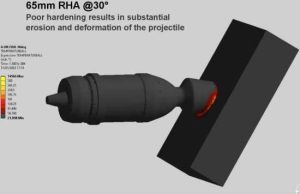 Это удивительный советский снаряд БР-350А — тупоголовый каморный, взрыватель МД5. Советские снаряды БР-350А и БР-350Б пробивали 50-63-мм и 62-76 мм стали соответственно и имели оригинальную форму (затупленный нос если убрать обтекатель).Этот снаряд использовался в советских танках Т-34 и КВ-1 во время Второй мировой войны и вероятно, был разработан таким образом, чтобы улучшить характеристики против наклонной брони. Тупой нос вырвет часть брони, а узкая последующая часть явно предназначена для разрушения, предотвращая передачу момента на основной корпус. Снаряд представляет собой стальную болванку. БР-350А не имел никаких преимуществ по сравнению с другими советскими тупоносыми снарядами, такими как БР-350Б, вероятно, поэтому ни один другой снаряд не имеет подобной конструкции. Компьютерная симуляция попадания снаряда БР-350А в 76-мм в 65-мм броню под углом 30 градусов и 40-мм броню под углом 60 градусов.