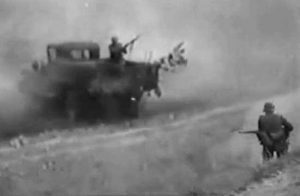 Это почти фантастические кадры, запечатлеть такое на войне удавалось крайне редко.Данная хроника продолжительностью 10 секунд случайно попала в выпуск немецкого еженедельника. Известно, что кадры сняты под Минском в первые дни июля 1941 года.На кадрах хроники видно, что советский грузовой автомобиль в котором были как минимум 3 красноармейца, попал под огонь немцев на дороге и свернул […]