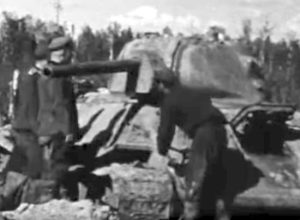 На 12 минуте немецкие солдаты исследуют Т-34 застрявший в месиве из болота и стволов деревьев, видимо по зимним боям. Чинят его гусеницы, крутят башню, заводят и пытаются выехать — видимо без успехов. Далее толпа немцев тащат на себе через болото полевую гаубицу. Хроника без звука, суммарно почти 30 минут, качество не очень хорошее, но представление дает. Так немцы ходят в москитных сетках, а когда приходит врач, чтобы проверить одного солдата, то даже от полураздетого солдата постоянно отгоняют комаров. Немцы регулярно пьют шнапс, особенно после торжественного награждения. Лесные дороги залиты водой по колено, снабжение затруднено.20-я пехотная дивизия Вермахта. Так же из интересного — на хронику попали кадры создания блиндажей и и немного боев.