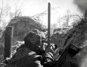 «Декабрь 1942. В минуты затишья мы были частыми гостями в стрелковых ротах. Однажды стрелки встретили меня строгим предупреждением, что вот мол на их участке появился немецкий снайпер — уже семеро наших неосторожных солдат поплатились жизнью за это. Единственный способ обнаружить его было наблюдение через перископ разведчика (труба разведчика ТР-4).Я приступил к длительному и трудному наблюдению […]