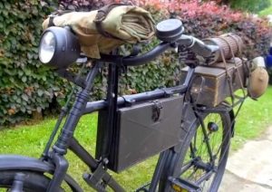 Чудом сохранившийся в Европе, комплектный немецкий военный велосипед вермахта (побит осколками). Некоторые его особенности: питание фар не только от «динамки», но и с переключением от миниаккумулятора, уникальная тормозная система со штоком, куча штампов WH на втулках и раме. На раме имеется специальное крепление для винтовки, жестяная коробка-бардачек с дополнениями для велосипеда, широкий багажник с ремешками […]