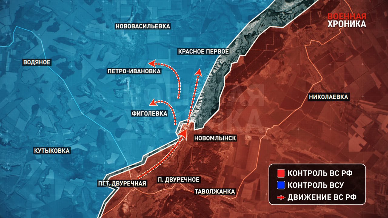Штурмовые подразделения 25-й отдельной мотострелковой бригады ВС РФ совершили почти пятикилометровый успешный бросок на отрезке Двуречная — Новомлынск вдоль левого берега реки Оскол. Под контролем группировки войск оказался не только Новомлынск, но и ряд тактически важных господствующих высот в 1—1,5 км севернее Новомлынска.