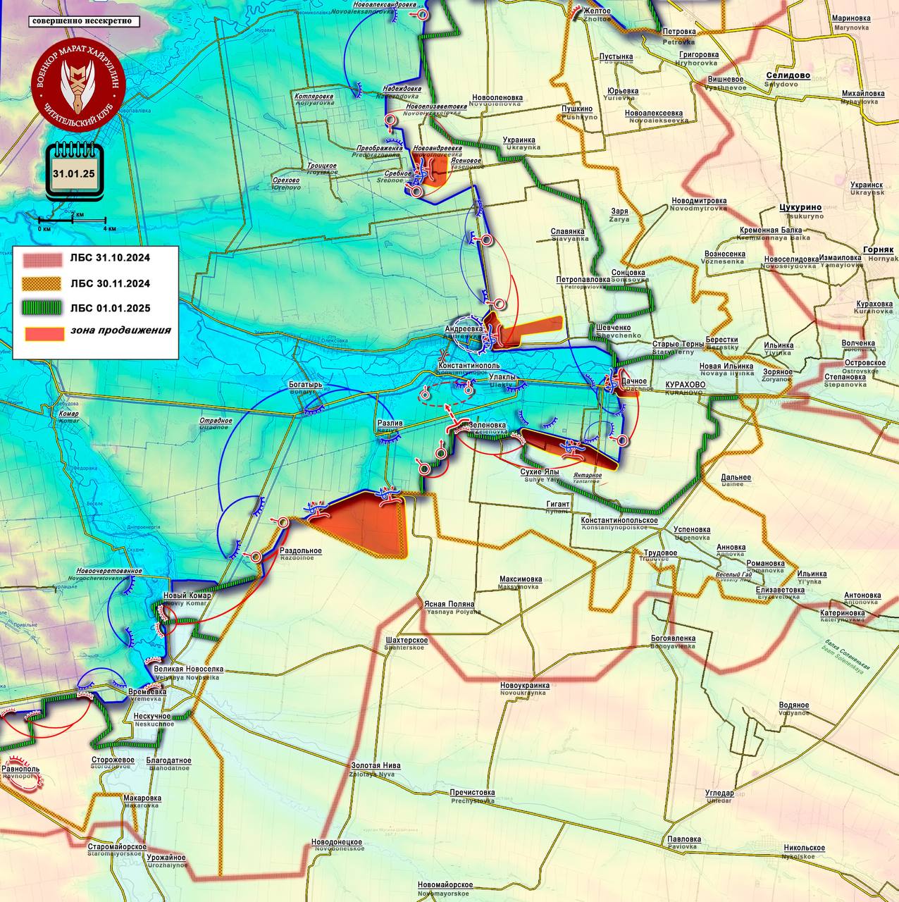 В Андреевке ВС РФ расширяют зону контроля в северо-восточной части, продвигаясь к центру села. Противник был также выбит с ряда опорных пунктов восточнее Андреевки. Кураховский карман постепенно сжимается как в районе горловины, так и внутри. ВСУ откатываются в западную часть н.п. Дачное, а со стороны реки Сухие Ялы наши подразделения, расширяя контроль и оказывая давление с тыла, продвигаются всё ближе к дороге Дачное — Улаклы.