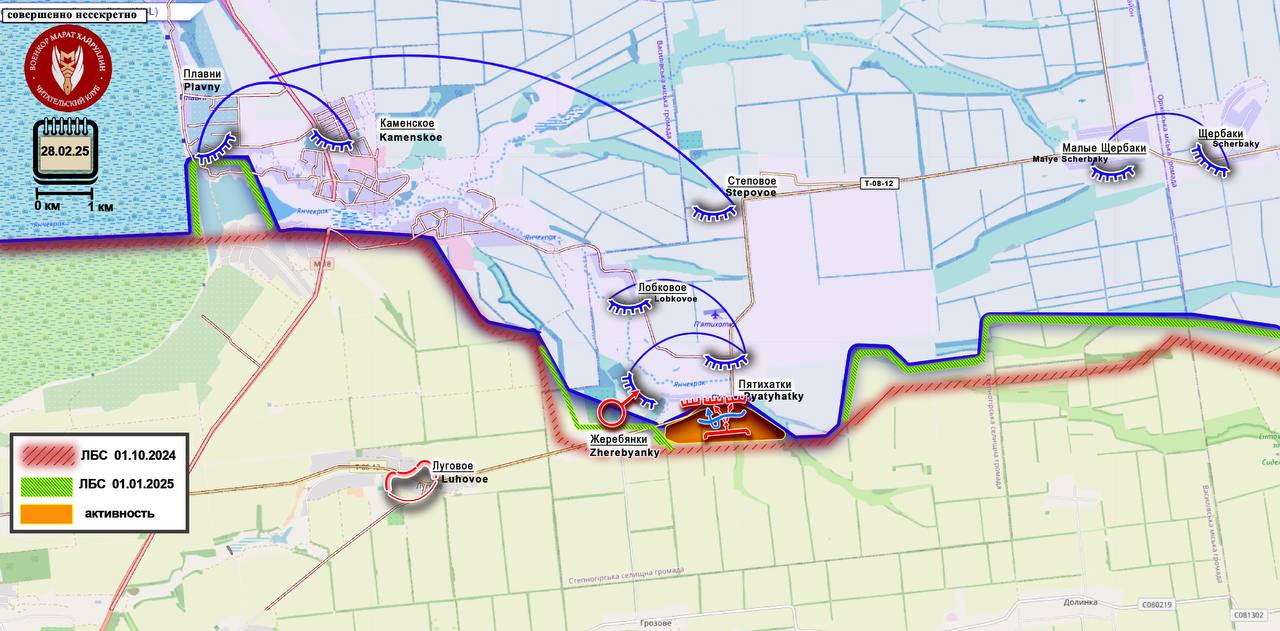 На Запорожском направлении российские войска закрепились в н.п. Пятихатки. Основные боестолкновения идут за контроль над лесным массивом западнее села. Массив является естественным рубежом обороны для противника, позволяя ему стягивать туда резервы и проводить манёвры. Контроль над ним с нашей стороны снизит угрозу флангового удара и обеспечит условия для дальнейшего продвижения к н.п. Лобковое и Степовое. Этот район обеспечивает на данный момент логистику между населёнными пунктами Каменское и Орехов.