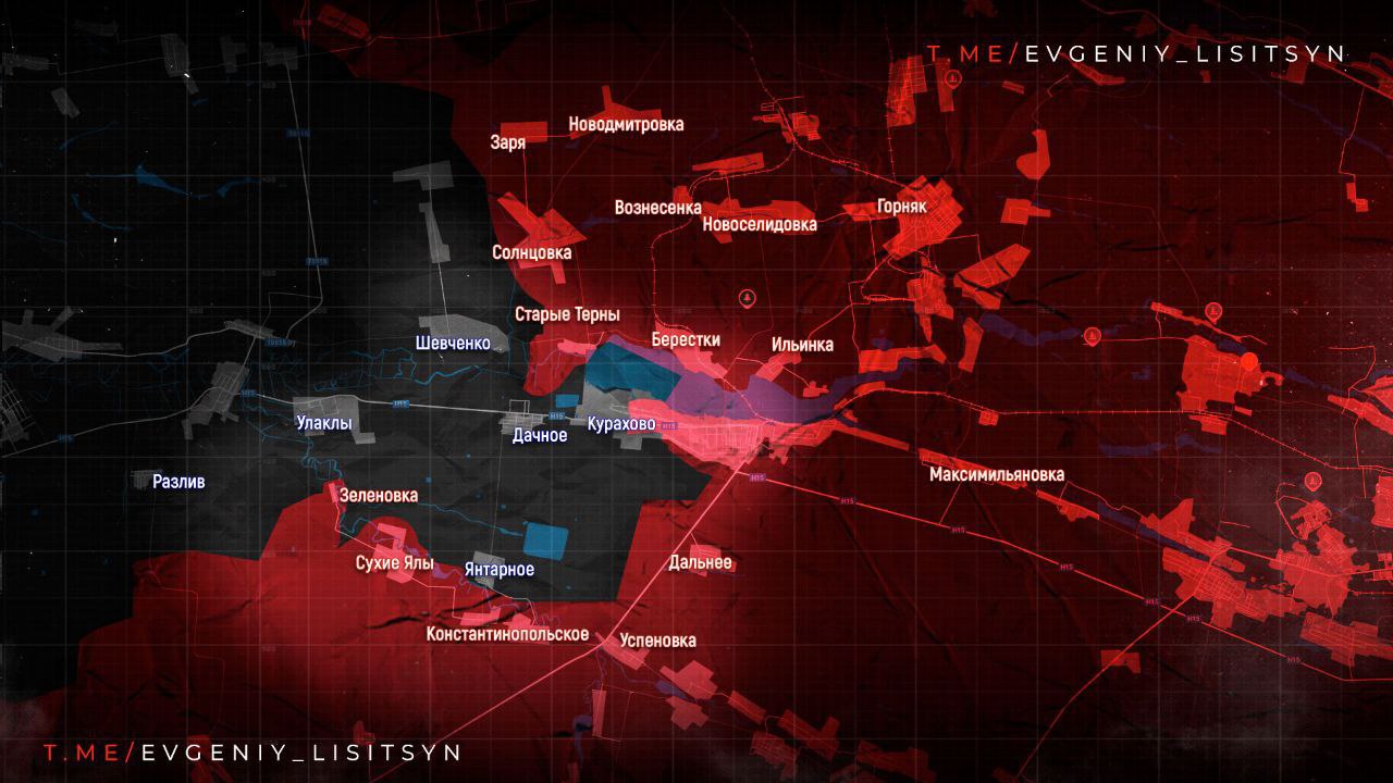 На Кураховском направлении ВС РФ зашли в селе Славянка и Петропавловка, а также продолжают бои в Курахово в районе Трубного завода и южнее города.