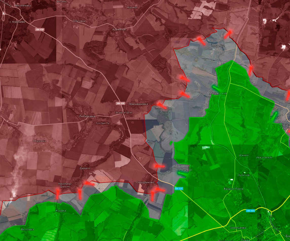 К востоку от Свердликово российские силы заняли Лебедевку и прилегающие территории, расширяя зону контроля. Это продвижение создает угрозу для позиций ВСУ в западной части плацдарма и вынуждает украинское командование перебрасывать резервы для стабилизации фронта.