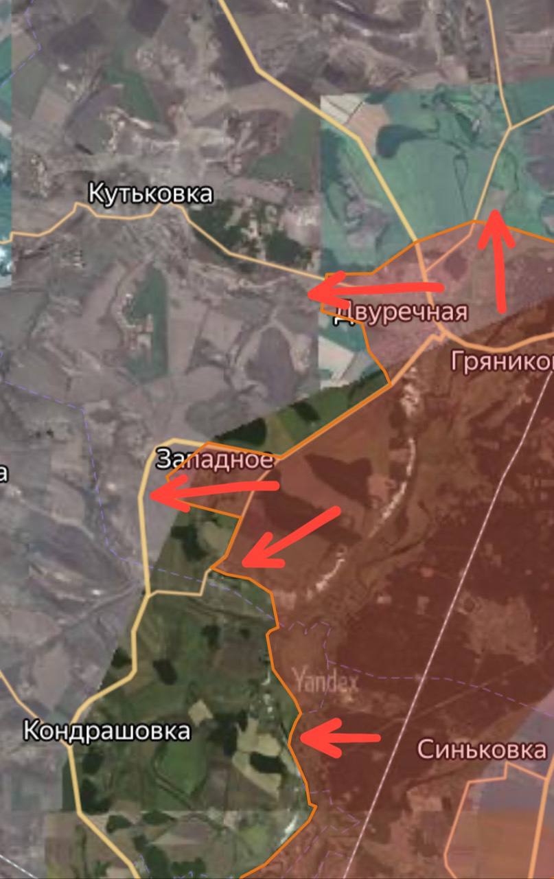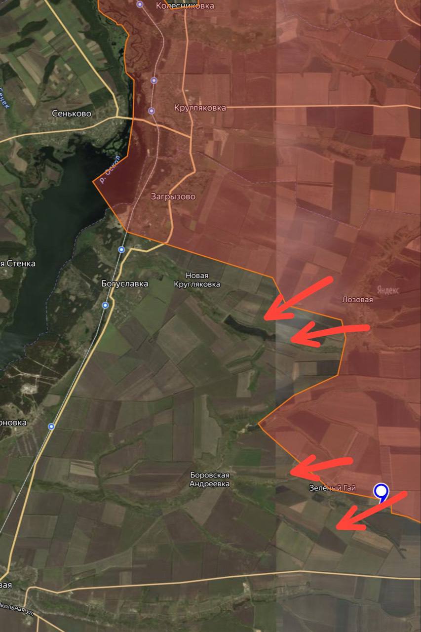 Купянское направление. Развиваем наступление южнее Западного вдоль русла реки Оскол, продвинулись ещё на 1 км, чем создаем группировке врага у Кондрашовки дополнительную угрозу.