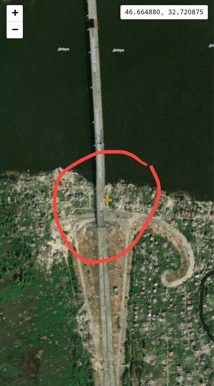 Антоновский мост. (Антошка) наш берег. В течение двух дней противник вёл массированный удар по нашим точкам. Антоновский участок был самым напряжённым.н.п. Алешки крыли БПЛа и тяжелая артиллерия, в городе складывается тяжелая ситуации. Противник в количестве до 10 человек предпринял попытку переправы на наш берег в районе моста. Наша разведка сработала отлично. Есть информация, что большую часть противника уничтожили наши расчёты малой беспилотной авиации. Также есть вероятность, что противник движется в район Наири и дачный сектор в целях укрытия. Часть осталась под мостом. Мужики сейчас работают.