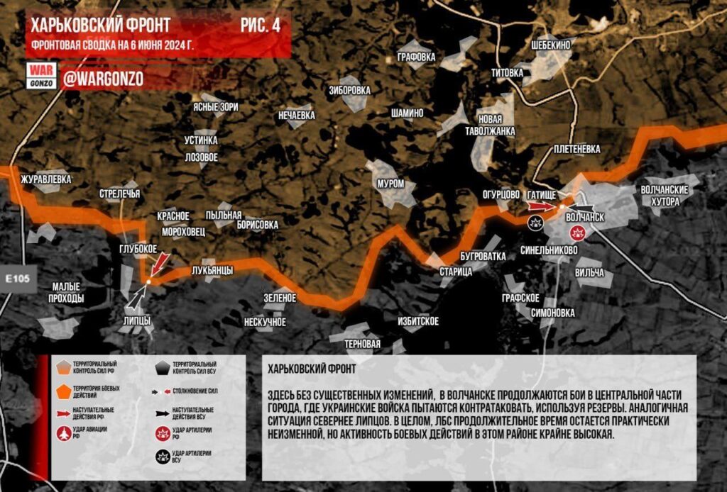 Харьковский фронт. Здесь без существенных изменений, в Волчанске продолжаются бои в центральной части города, где украинские войска пытаются контратаковать, используя резервы. Аналогичная ситуация севернее Липцов. В целом, ЛБС продолжительное время остается практически неизменной, но активность боевых действий в этом районе крайне высокая.