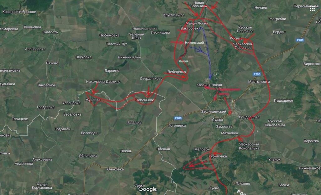 Противник пытается нанести удар вдоль русла реки Нижняя Двуречная, стремясь разделить российский плацдарм и лишить ВС РФ возможности манёвра. В этом секторе идут интенсивные встречные бои, ВС РФ ведут контрударные действия, не позволяя украинским подразделениям достичь поставленных целей.