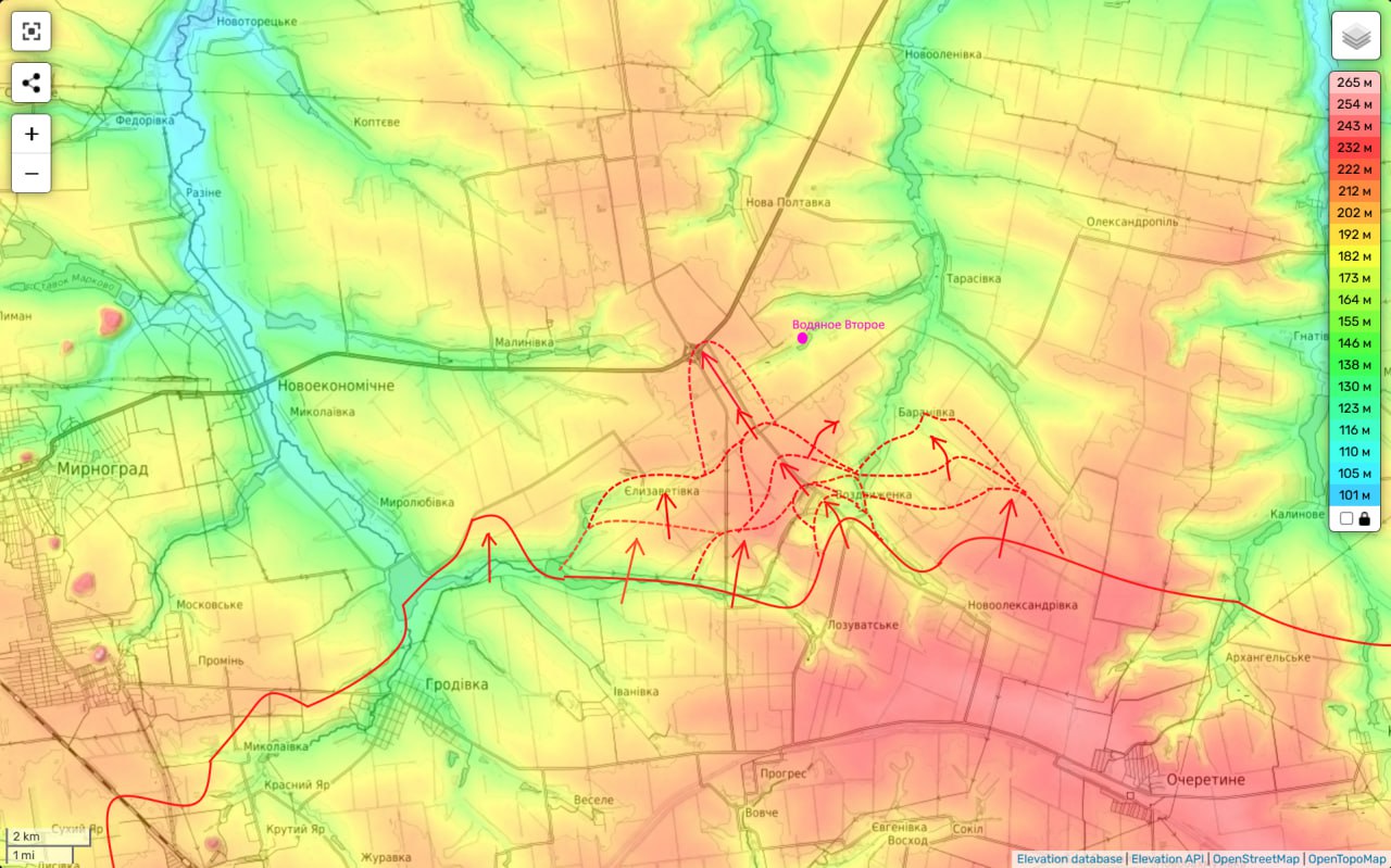 Но самую главную угрозу противнику на Кураховском направлении представляют наши успехи не южнее, а севернее реки Волчья, где накануне была полностью освобождена Славянка (а еще ранее Петропавловка и Шевченко). И теперь здесь, прорвав оборону противника на естественных рубежах, мы пытаемся с северо-востока (по холмам) выйти к Андреевке. Здесь оборону со стороны противника держит 590я бригада, которая, упорно сопротивляясь, постепенно откатывается на запад.