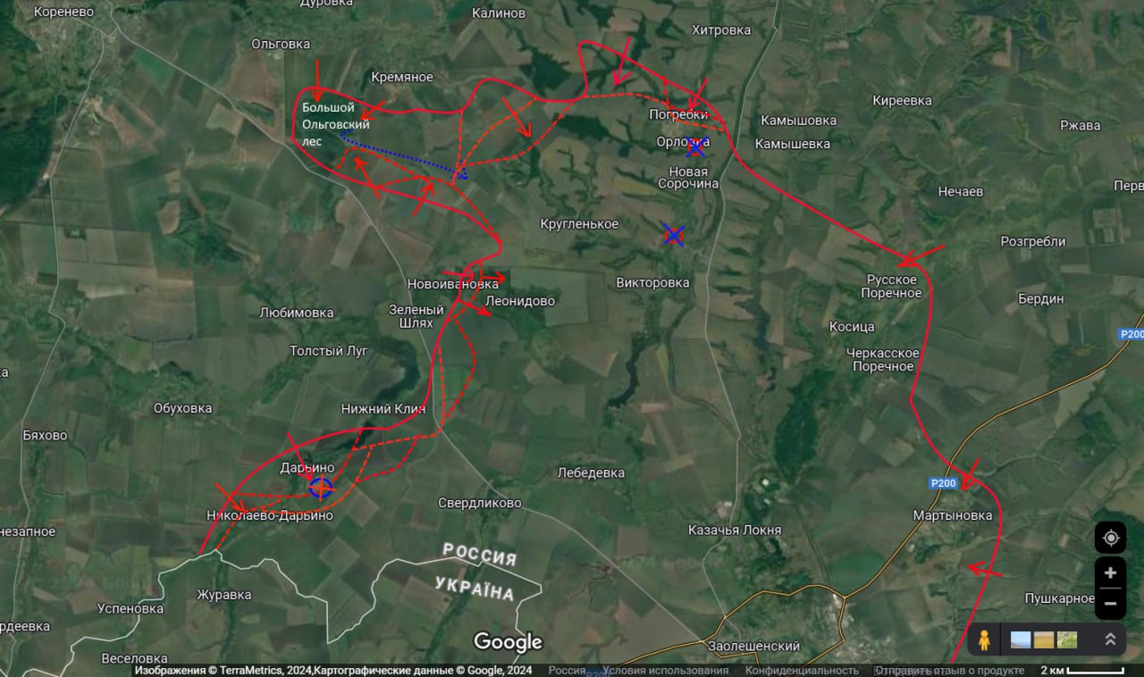 Во-первых, в районе Дарьино-Новый Клин нам удалось закрепиться на новых позициях по направлению к Свердликово. Здесь главной проблемой являются открытые обширные поля до самого этого села, превращенного противником в мощнейший укрпрайон. На самом деле выбить его отсюда задача архисложная.