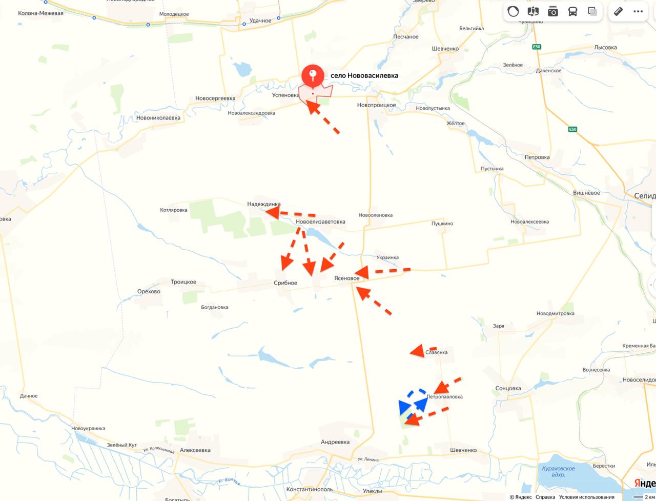 Южнее наши подразделения атакуют в районе Серебряное (Срибное) — Новоандреевка — Ясеневое.