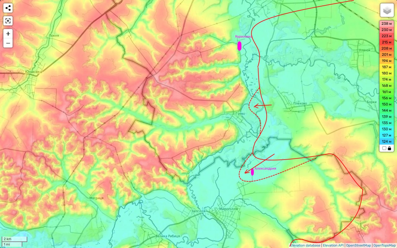 Также я специально все вынес на рельефную карту, чтобы вы смогли понять сложность задачи, которая стоит перед нашими парнями, если у них есть задача удара в обход Суджи с юга. На самом деле занятие Плёхово, особо эту задачу не решает. Все зависит от контроля холмов западнее села. Только это позволит нам заметно усложнить логистику Суджанской группировки ВСУ. Но кроме того, что противник расположен на холмах, он еще и прикрыт довольно полноводной даже сейчас рекой Псёл.