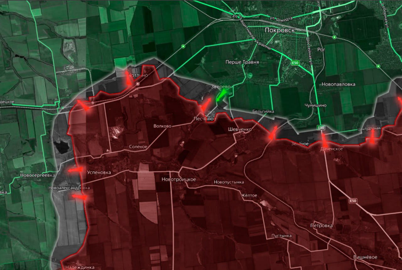 На Покровском направлении Вооруженные силы Украины продолжают наступление в районе Песчаного, чуть отодвинув серую зону. Восточнее Покровска ВС РФ продвигаются в сторону трассы Покровск-Константиновка в районе развязки. Идут бои у н.п. Елизаветовка, Водяное Второе и в районе н.п. Барановка. Южнее Покровска продолжаются бои у н.п. Срибне.