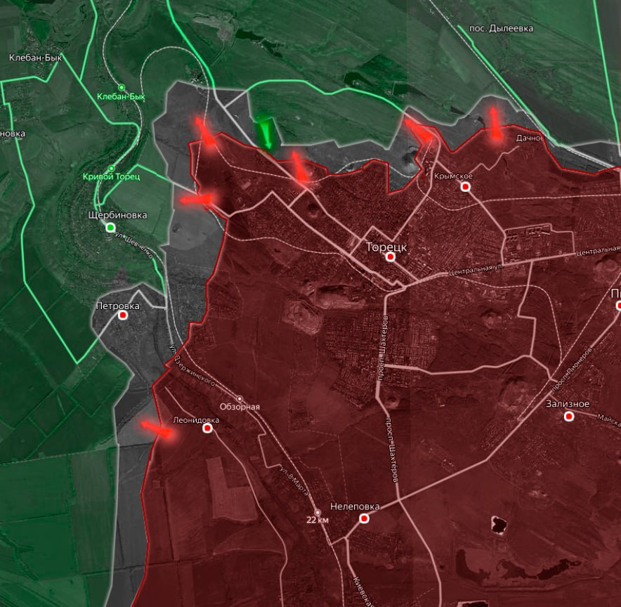 На Торецком направлении российские подразделения достигли Нелеповки — села к югу от Иванополья, входящего в пригородную зону Константиновки. Само присутствие ВС РФ в этом районе указывает на отсутствие полноценных опорных пунктов ВСУ вдоль трассы Торецк — Константиновка вплоть до Нелеповки. Это говорит о критической зависимости обороны украинских сил от использования дронов в данной зоне.