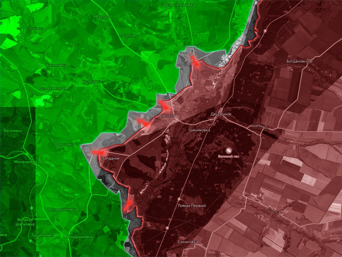 На Купянском направлении российские войска продолжают развивать наступление на западном берегу реки Оскол, расширяя зону контроля в районах Западного, Двуречной и Фиголевки. Одновременно начались боевые действия за Долгенькое, где ВС РФ пытаются вытеснить украинские силы с их позиций. Также отмечено продвижение российских подразделений в сторону Дорошовки, что может усилить давление на оборонительные линии ВСУ в данном секторе.