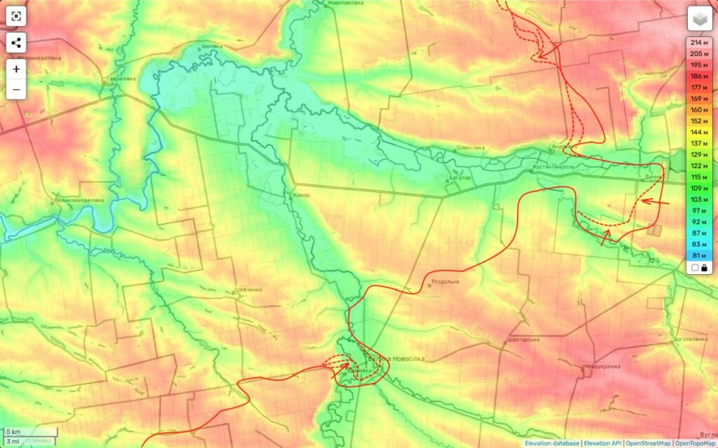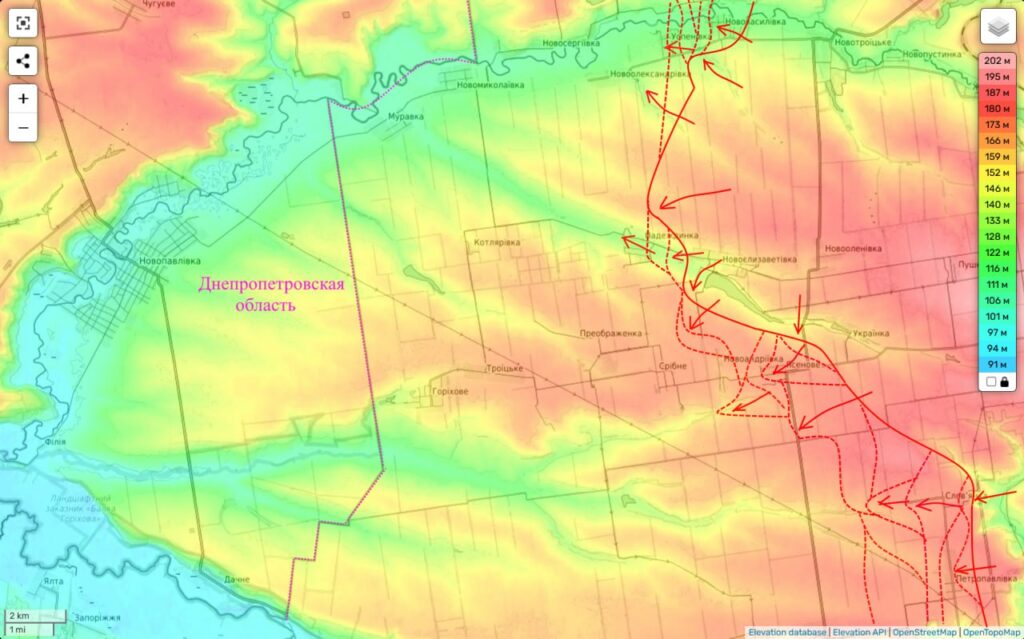 Таким образом фронт противника продолжает уверенно трещать и поддаваться назад, приближая нас сразу к двум целям — глубокому охвату Покровской агломерации с запада и … выходу к Днепропетровской области. До которой из занятой нами части Удачного осталось всего 5 км. А с западной окраины его будет и вовсе чуть больше 2 км.