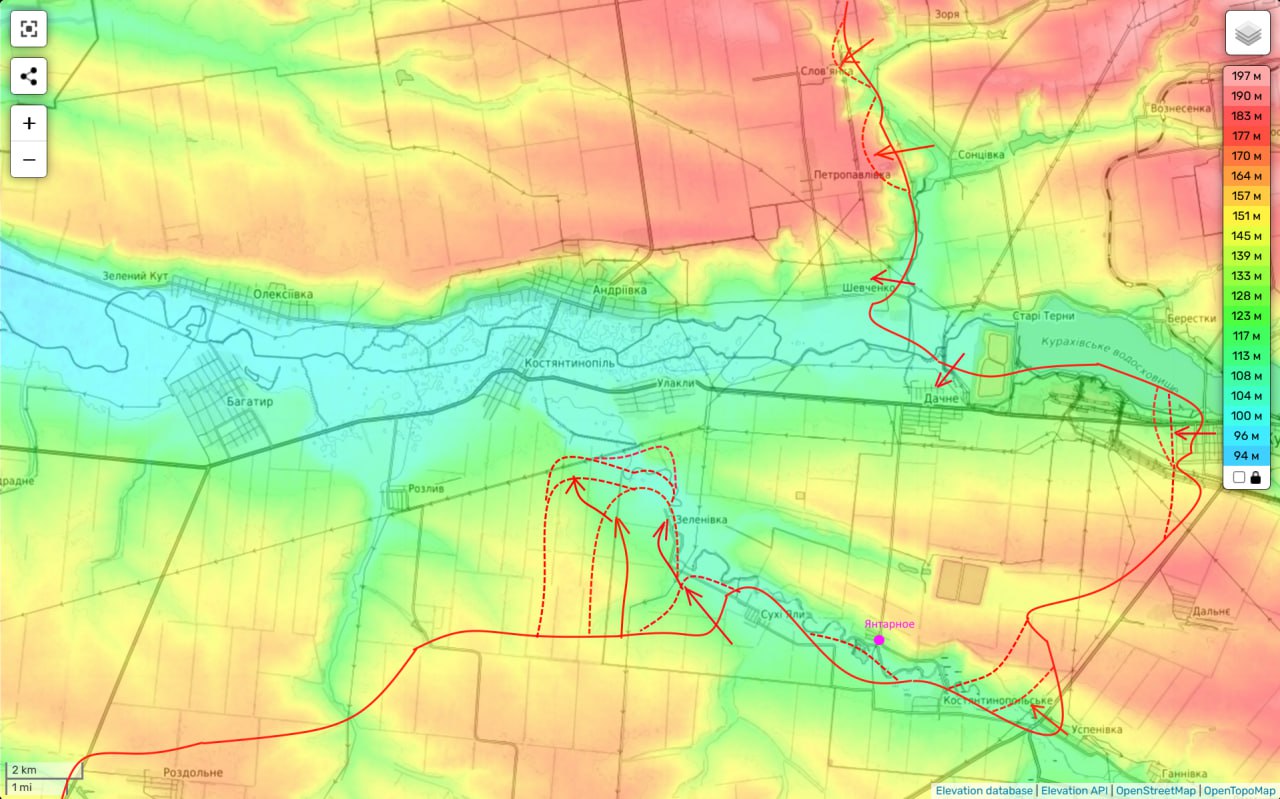 Таким образом этот участок фронта выполняет свою главную функцию (обеспечения наступления ВС РФ на Покровском направлении) и мы постепенно при этом движемся к границам Днепропетровской области. До которой нам осталось пройти около 8 км.