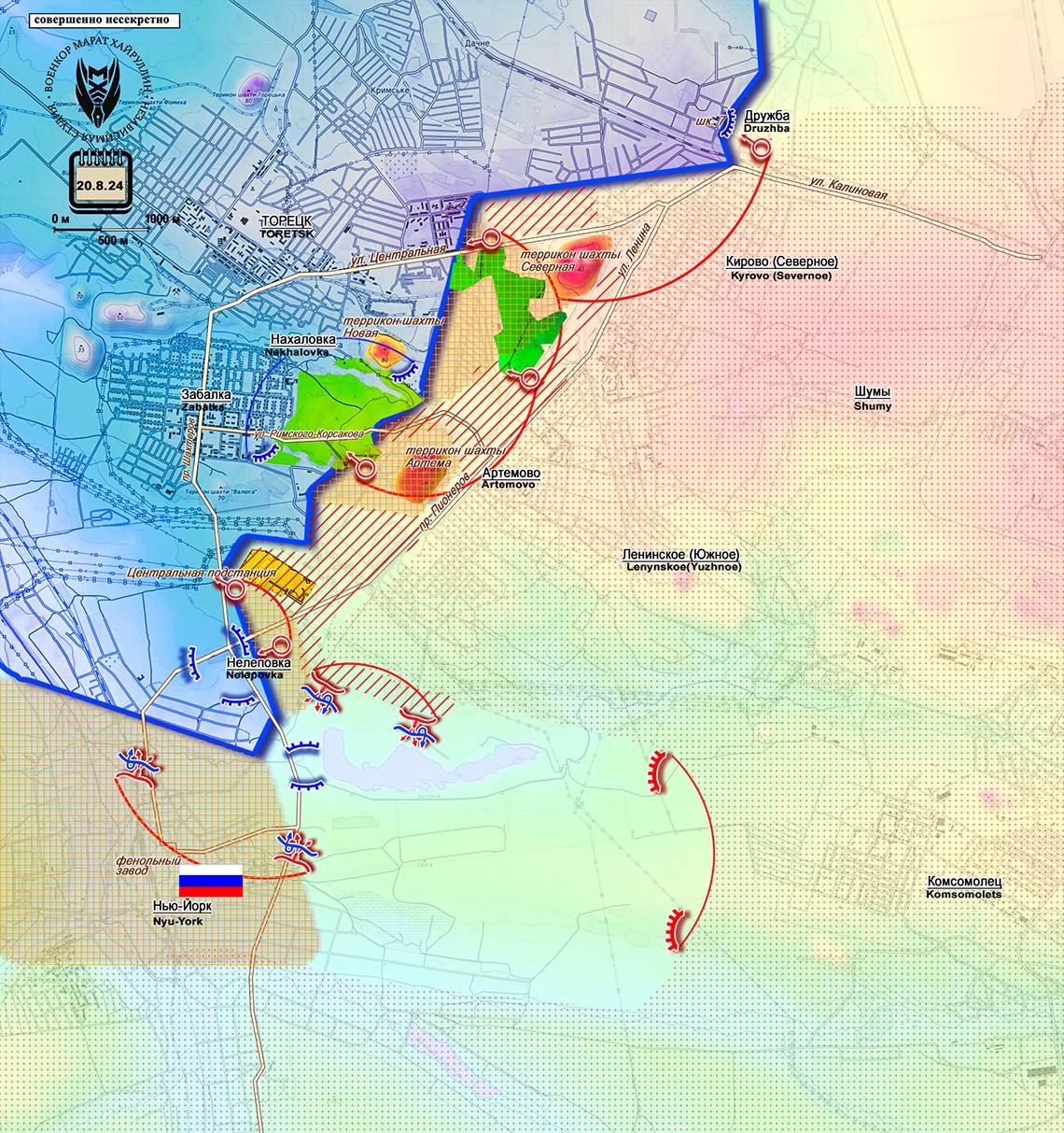 Донецкое направление. На Торецком участке Донецкого направления нашими вооружёнными силами был освобождён н.п. Артëмово. Пала основная линия обороны ВСУ на этом участке — терриконы шахт им. Артëма и Северной перешли под контроль наших подразделений. Боевые действия идут на восточной окраине Торецка в районе многоэтажек за терриконом шахты Северная.