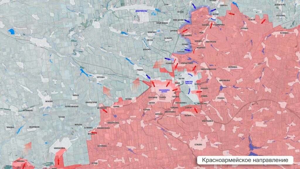 На Красноармейском направлении продолжаются городские бои. Подразделения ВСУ сообщают о затруднениях в применении БПЛА из-за неблагоприятных погодных условий. Российские военнослужащие используют сложившиеся метеоусловия для продвижения и зачистки городской застройки. Начальник Генерального штаба Герасимов заявил о установлении контроля над 70% территории Красноармейска. Продолжаются интенсивные боевые действия в Димитрове. В районах Родинского и Шахово также сохраняется напряжённая обстановка, однако подробная информация с этих участков отсутствует.