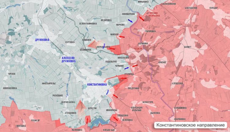 Константиновка Пехота противника малыми группами концентрируется в частном секторе и к северу от железнодорожного вокзала. ВСУ перебросили в город дополнительные расчеты беспилотников, что существенно тормозит продвижение российских частей. ВС РФ, расширив зону контроля на юге города, ведут охоту на операторов дронов, уничтожают антенны и ретрансляторы врага. Ожесточенные бои идут на линии Клиновое — Веролюбовка — Марково, а также в Миньковке.