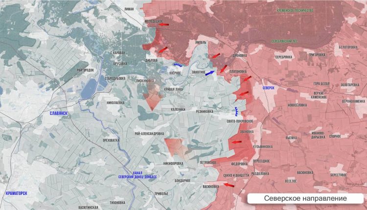 Краснолиманское направление Российские войска осуществляют охват Красного Лимана с юга, продвигаясь на рубеже Александровка — Яровая.