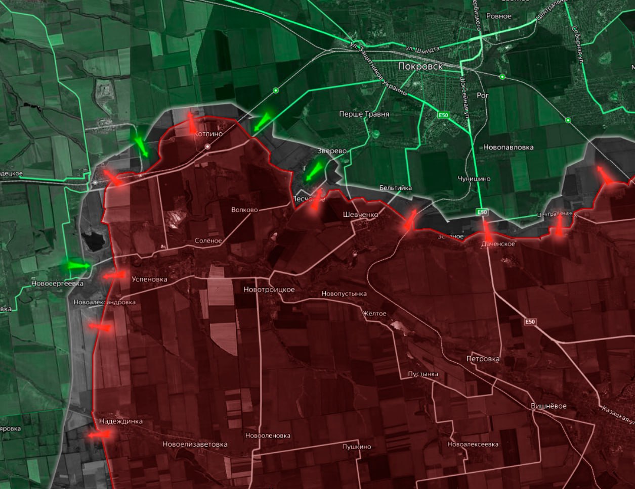 В районе Песчаного ВС РФ ведут наступление, стремясь вытеснить украинские силы с северных окраин, аналогичная ситуация наблюдается и в Лысовке, где идут бои за северо-западную часть населенного пункта. Одновременно фиксируется концентрация украинских подразделений в районе Покровска-Мирнограда, что может указывать на подготовку локальной наступательной операции ВСУ.