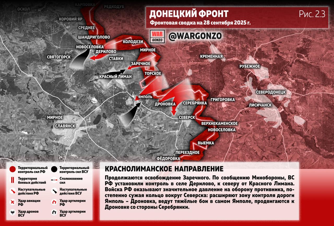 Особого внимания заслуживает ситуация вокруг Северска. Здесь российские войска постепенно сжимают кольцо, оказывая значительное давление на оборону противника. Расширяется зона контроля над стратегически важной дорогой Ямполь – Дроновка, ведутся бои уже в самом Ямполе, идёт продвижение к Дроновке со стороны Серебрянки. На этом же участке Минобороны подтвердило взятие под контроль села Дерилово, к северу от Красного Лимана, и продолжение зачистки Заречного. На Константиновском направлении также есть успехи: заняты новые позиции у Клебан-Быкского водохранилища и официально подтверждено освобождение Майского севернее Часова Яра.