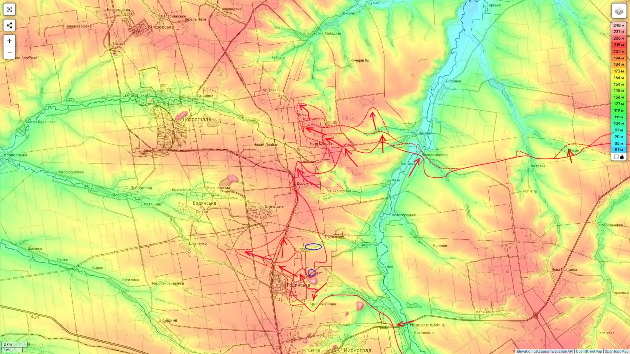 На пока им удалось здесь только стабилизировать фронт. А между тем, отсутствие нужного количества резервов привело к тому, что фронт севернее (в полосе 51А) у ВСУ продолжает сыпаться и мы уже здесь очень глубоко вклинились между Родинским и Билыцьким. А также движемся на Доброполье и обходим Шаховое (карта 2).