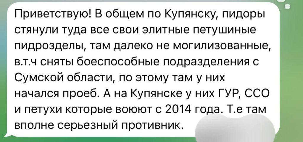 Купянский фронт Украинское командование продолжает насыщать западную часть города резервами, включая иностранных наемников и спецназ ГУР. Российские войска удерживают оборону, часть города находится в «серой зоне». Ранее командование сообщало, что противник будет выбит из города в течение двух месяцев.