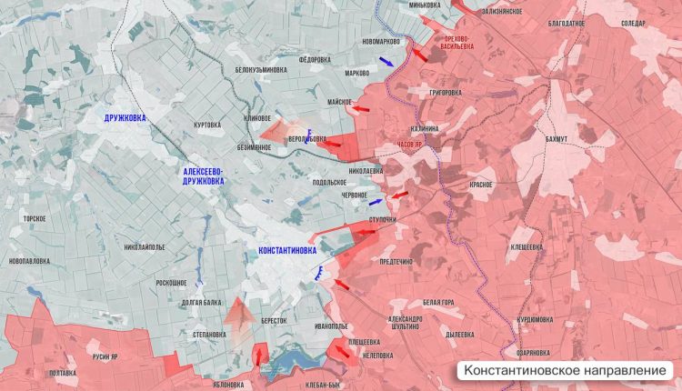 Константиновский участок ВС РФ занимают новые позиции у Степановки и Берестка, осуществляя охват Константиновки с юго-западной стороны. В Веролюбовке украинские военные удерживают оборону, идут жаркие бои. Поступают сведения, что севернее Часова Яра Новомарково фактически перешло под наш контроль, сейчас идут схватки за Миньковку и Марково.