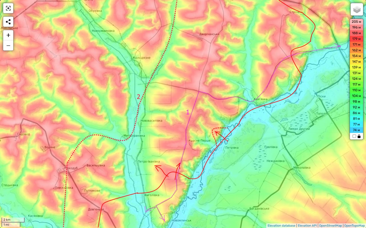 Похоже наше командование настроено взять под контроль территорию по линии «2», чтобы тем самым обеспечить снабжение заоскольского фронта не через переправы по Осколу, а напрямую с территории России (дорога «1»).