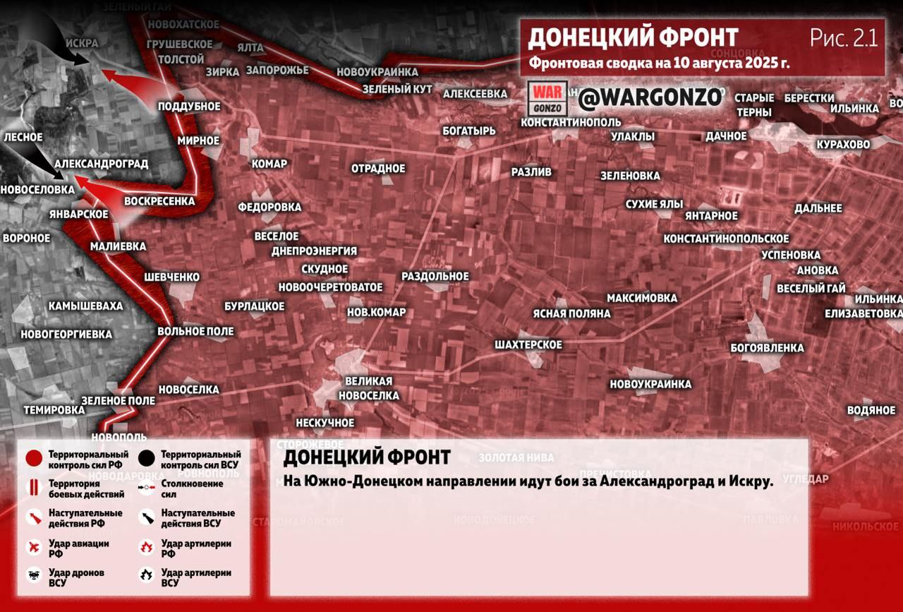 Донецкий фронт. На Южно-Донецком направлении идут бои за Александроград и Искру. На Покровском направлении ВС РФ продвигаются в районе Котлино, расширяют зону своего контроля в Леонтовичах и Троянде. На Константиновском направлении фиксируются тактические успехи российских войск в районе сёл Русин Яр и Полтавка. Минобороны РФ заявило об освобождении Яблоновки. Сообщается о присутствии ВС РФ на северных и западных окраинах Щербиновки, идут бои.