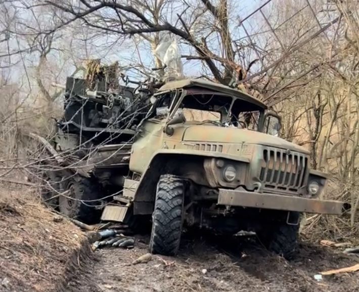 Уничтоженный украинский гантрак на шасси грузовика УРАЛ 4320 с установленной 57-мм автоматической зенитной пушкой АЗП-57 комплекса С-60.