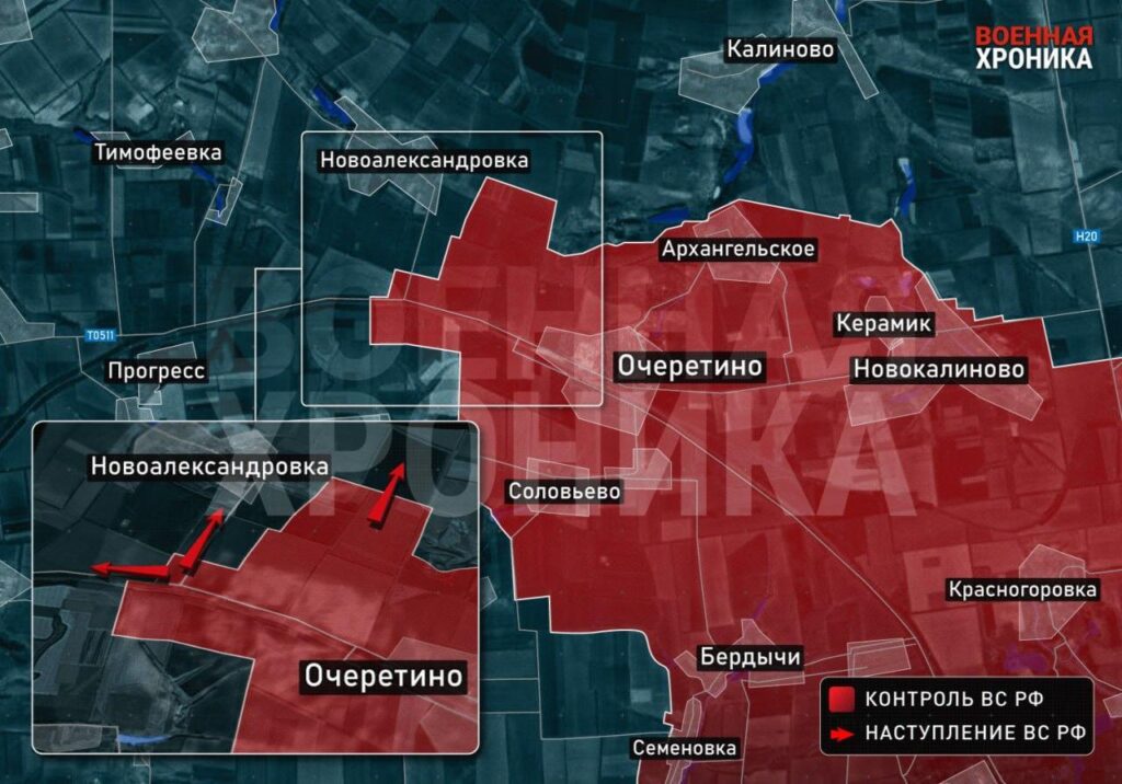 Куда двигается российская армия после взятия Очеретина? Фронт медленно, но стабильно смещается российской армией на запад. ВС РФ идут строго по ключевой высоте в сторону соседнего села Прогресс. До него порядка 7 км, если идти прямо по железной дороге и вдоль прилегающей трассы Т-0511. Параллельно развивается удар со стороны н. п. Соловьёво в сторону Сокола. Здесь между трёх сёл — Сокол, Евгеновка и Восход — после Авдеевки ВСУ возводили относительно удобный для обороны укрепрайон.
