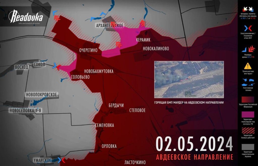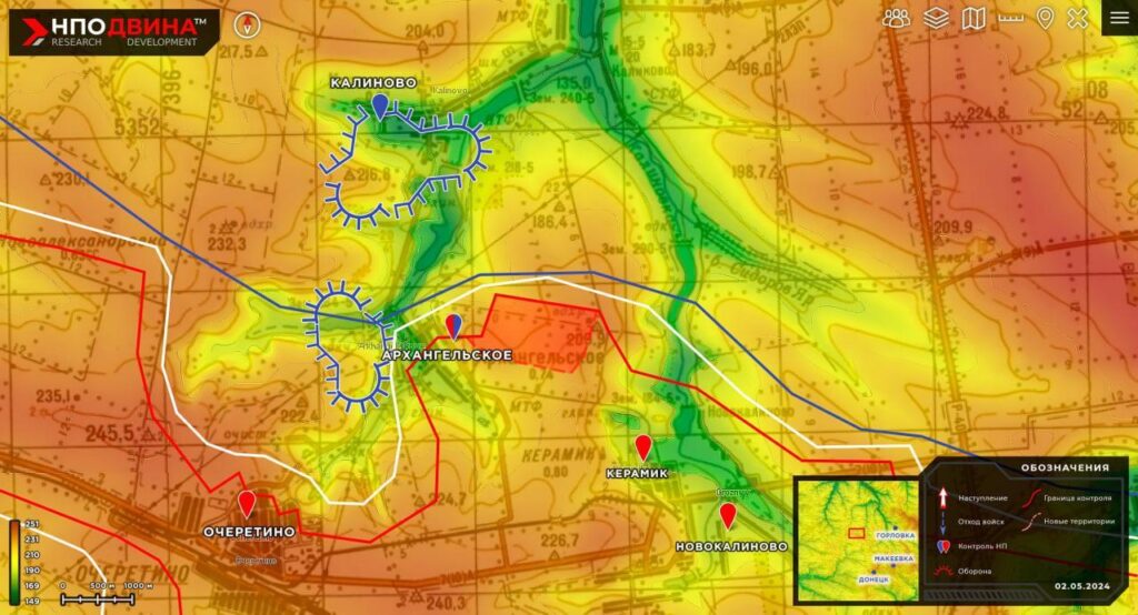 Также продолжаются бои за Архангельское. Противник опирается на укрепрайон к западу от Архангельского и Калиново, которое будет следующей целью. Взятие опорника к северу от Очеретино позволит обеспечить полный контроль над северной частью поселка, после чего МО РФ и объявит о его освобождении.