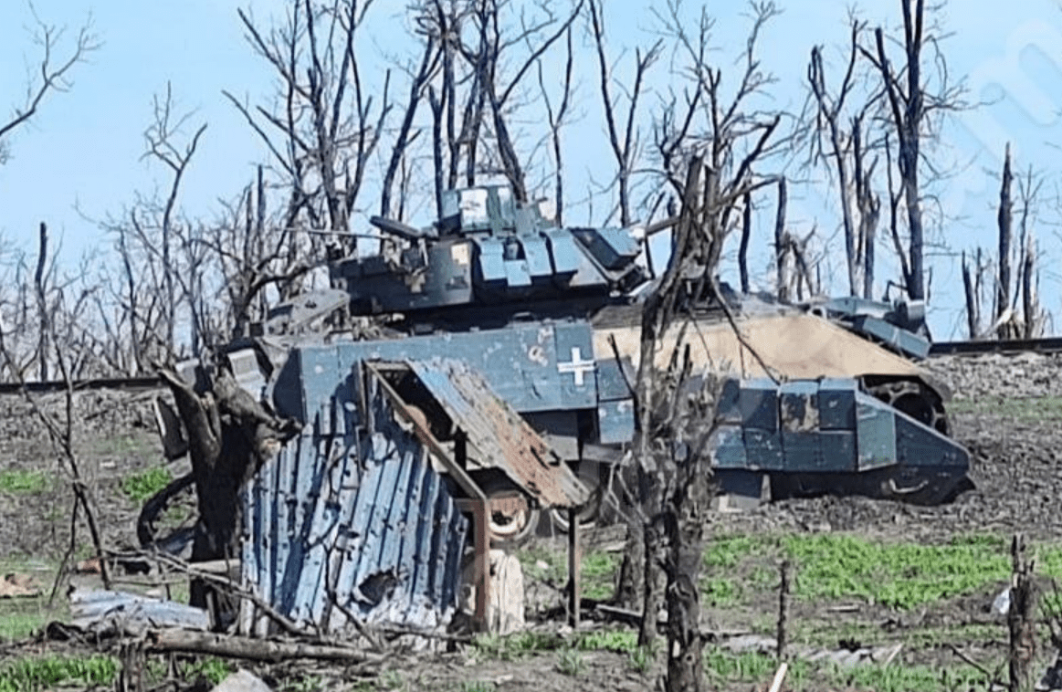 Наш подбитый Т-80БВМ и американская Bradley у железной дороги недалеко от Петровского, где долгое время шли ожесточённые бои. Сейчас линия фронта сдвинулась дальше.