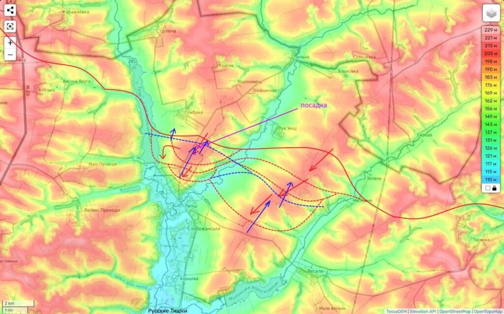 Собственно, именно поэтому ВСУ так отчаянно цеплялись за северный берег реки Волчанки. Чтобы с него удобно было начинать атаки. Здесь идут очень ожесточенные бои. Артиллерия с двух сторон работает как бешенная.