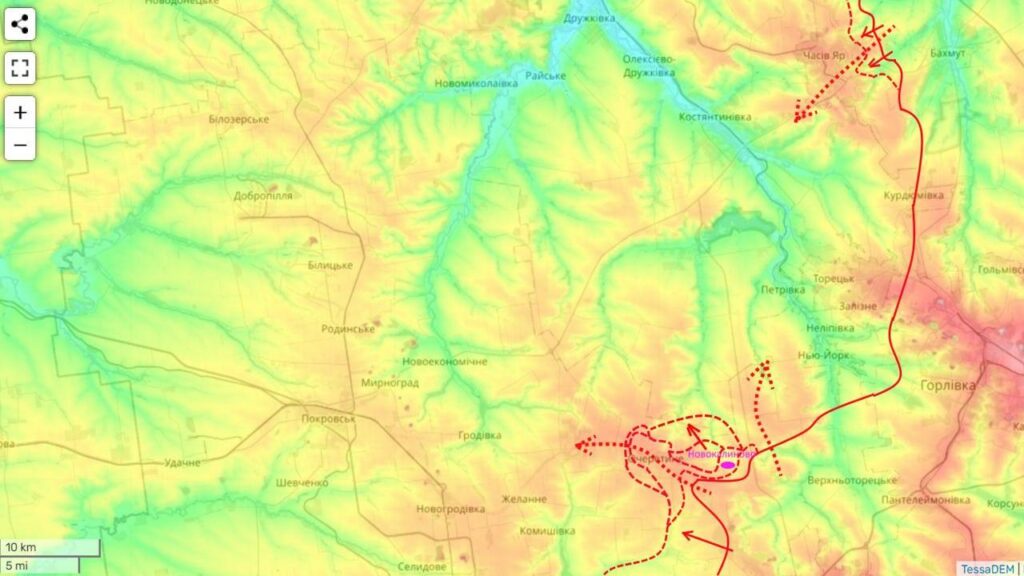 И так практически везде. Сейчас мы пошли на юг от Новобахмутовки, что обнуляет сильную позицию ВСУ под Уманским. Заход по водоразделу южнее Сокола обнулит значимость позиций в районе Новопокровского и Новоселовки Первой.