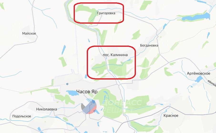 Севернее Часов Яра, в направлении на Краматорск идет активное продвижение ВС России севернее и западнее Григоровки вдоль канала Северский Донец–Донбасс, сообщают военные паблики.