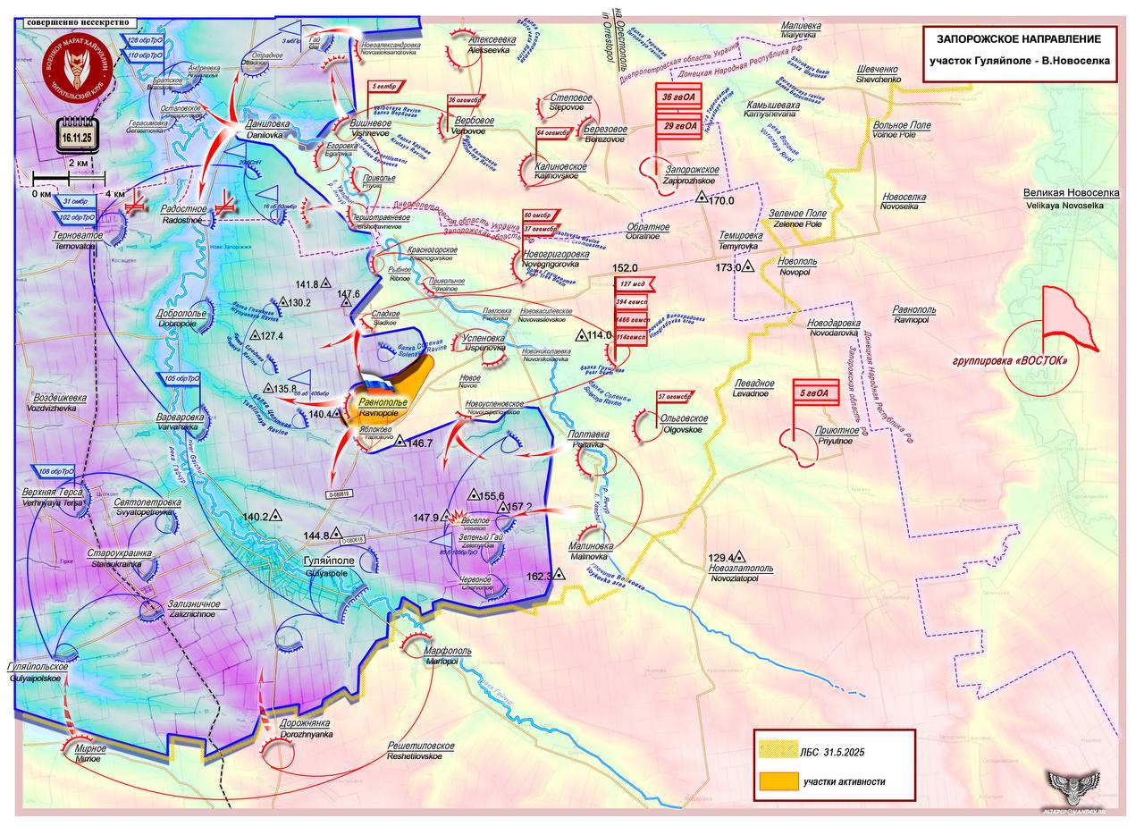 Минобороны России сообщило, что подразделения группировки «Восток» взяли под контроль село Равнополье (Запорожская область). Население села составляет около 370 человек. Примечание: в некоторых источниках село упоминается как Ровнополье. Мы используем название Равнополье согласно топографической карте Генштаба ВС СССР L-37-001 (1991 год).